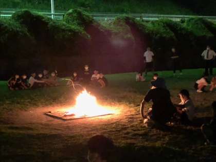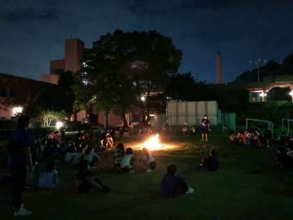 キャンプファイヤーを楽しみました。火の神と火の子が海洋センターに火の光をともします。実行委員が考えたさまざまなゲームで盛り上がりました。みんなでなかよくこころをつないで、素敵なおもいでができました!