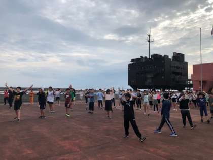 朝の集いを行いました。みんなで元気に堺っ子体操。そして、今日の活動について、先生から連絡がありました。この後集合写真をとって朝食です!