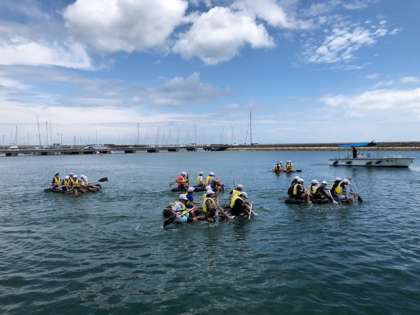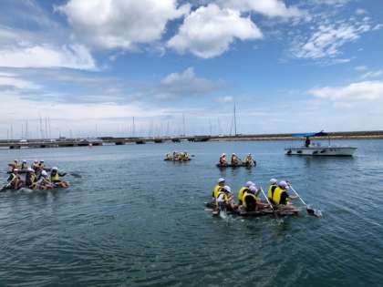いかだを陸へと向かわせます。右側に乗っている人と左側に載っている人の漕ぐバランスを考えないと真っ直ぐ進みません。互いへの信頼と友だちを思いやる友情が必要ですね。