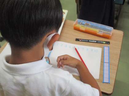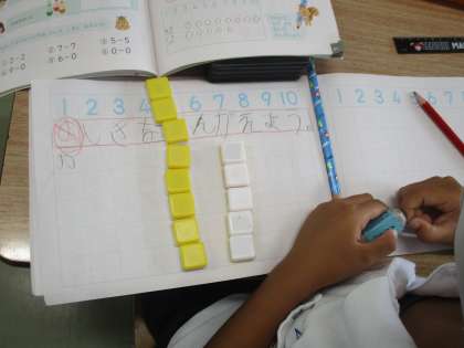 8個と5個のブロックを置くことができています。簡単なようですが,金魚をブロックで表すことも大切な学習です。