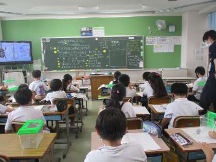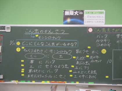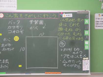昆虫の体のつくりについて学習しています。実際にバッタを捕まえて観察しました。