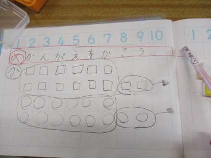 はさみと鉛筆の分の図を並べて,違いの2つを囲んでわかりやすく表しています。