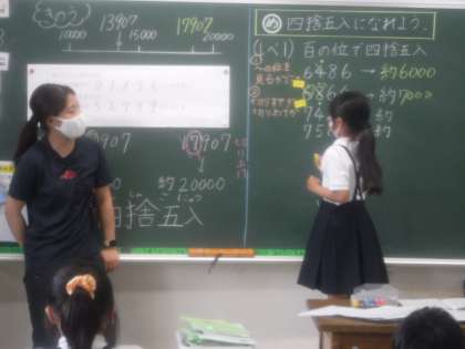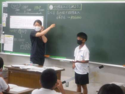 およその数の学習です。問題解決ができたら,友だちと話し合ったり,いろんな人が前に出て発表したりと,クラスのみんなで学習を深めています。