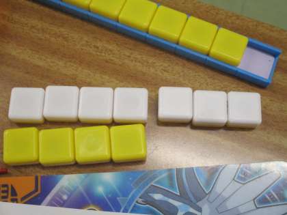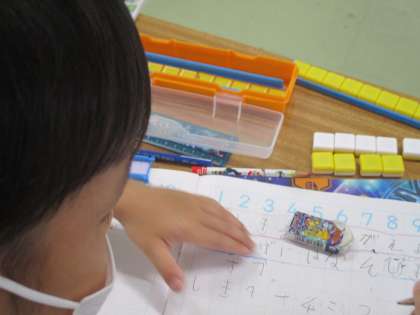 この問題を式に書き表しているところです。操作したブロックを見ながら,7−4=3と正しく式に表していました。