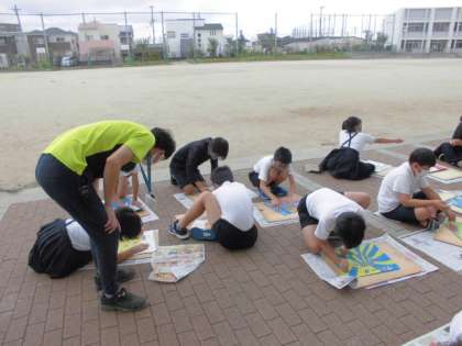 6年生が自分の描いた絵に,蝋燭(ろうそく)で「ろう」を塗っていました。