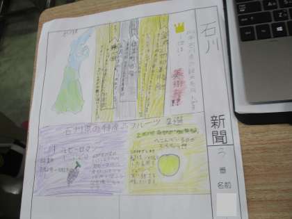 石川県について調べています。県の特徴ある取り組みや特産物について,紙面の構成を考えながら作っています。