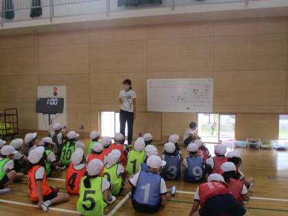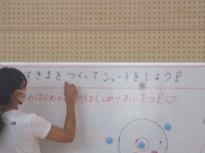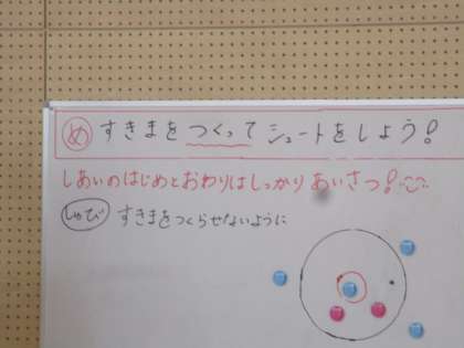 2年体育の学習の様子です,円の外側にいる攻撃側の3人が,守備側2人の守りを破って円の中心にいるゴールマンにパスが通れば1点になります。
