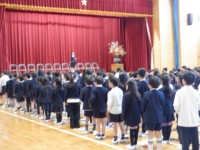 今朝の登校の様子です。校外学習に行く4年生が出発に合わせて早く来ていました。
