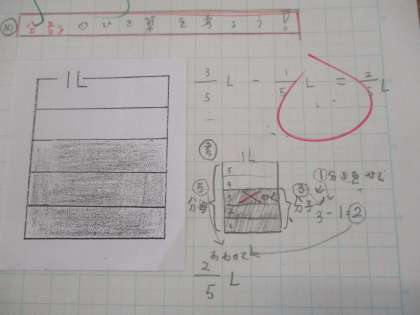 分子のひき算だけでよい ということが図からわかりますが,先生からはなぜ分母はそのままなのか という問いかけが出ています。