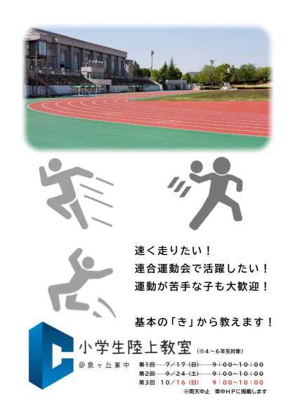 事前に配布したチラシに記載の、10/15(土)開催予定『小学生陸上教室【第3回】』は、当日中学校で東中フェスタが開催されますので、翌16(日)9:00〜10:00に日程を変更します。よろしくお願いいたします。