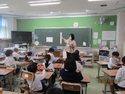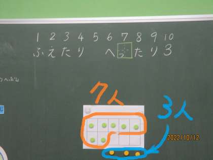 3つの数の計算になる場面について学習しています。「7人乗っていて,3人乗ってきて,4人降りたら,残りは何人か」という場面です。