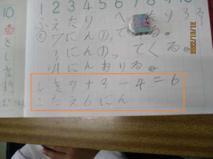 1年1組 算数 3つの数の計算 5 公開日 2022/10/12 更新日 2022/10/12 1年 問題場面をブロックなどで再現した後,この場面を式に表しました。7+3−4=6と書いていますが,どうでしょうか・・・。