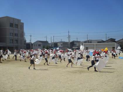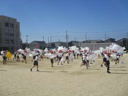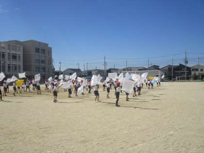 天気がいいので,大きく振られた手具(袋)がとてもきれいに見えます。