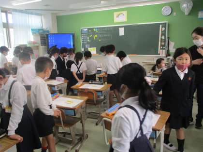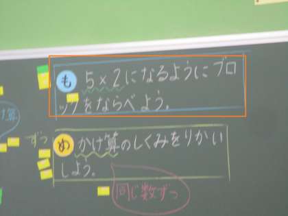 2年3組 算数 かけ算 1 公開日 2022/10/14 更新日 2022/10/14 2年 2年算数のかけ算の学習です。5×2になるようにブロックを並べています。みんなが並べたものを見てまわっています。