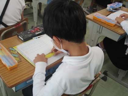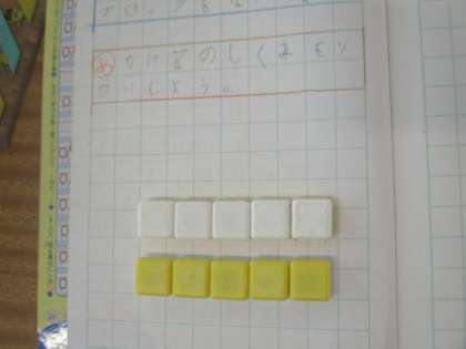みんなの考えを見て回ったところで,もう一度,5×2をブロックで並べています。