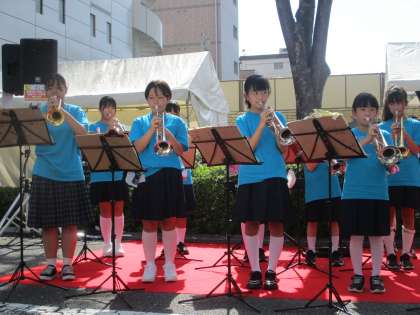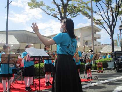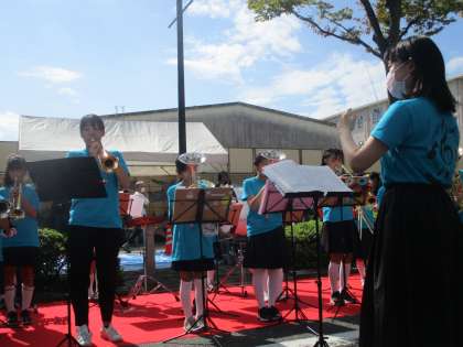 青空にいい音が響いています。今日は中学生の先輩たちも演奏に加わってくれています。