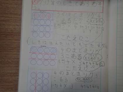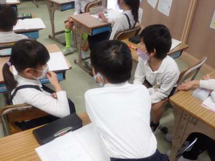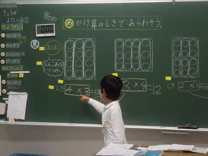 かけ算の式に表す学習をしています。1つ分の数がいくつあるのかを図で考え,式に表していました。5年生の割合の学習に直結する学習でもあるので,丁寧に進めていました。また,子どもたちは,どうして式が違うのに答えが等しくなるのかという疑問をもち,多様な考えから,かける数とかけられる数が入れ替わると答えが等しくなるという結論にたどりつきました。自然に問いが生まれたり,発展的に考えたりして,子どもたちは主体的に学習していました。