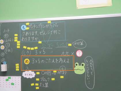 2年算数のかけ算の学習です。3×5の場面を考えています。