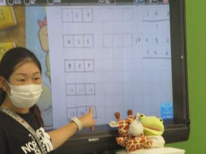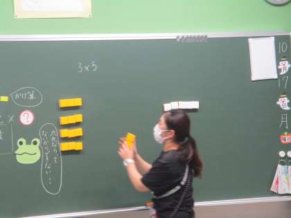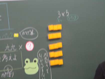 黒板にブロックを並べて,3×5について確かめています。