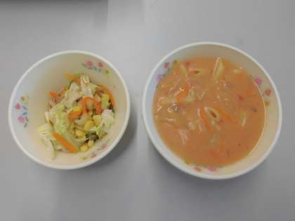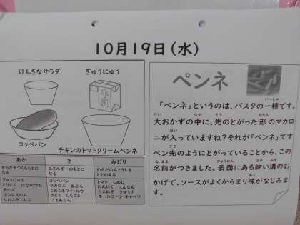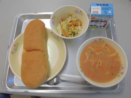 今日の献立は,「コッペパン・牛乳・チキンのトマトクリームペンネ・元気なサラダ」です。