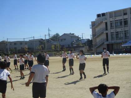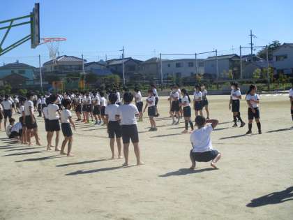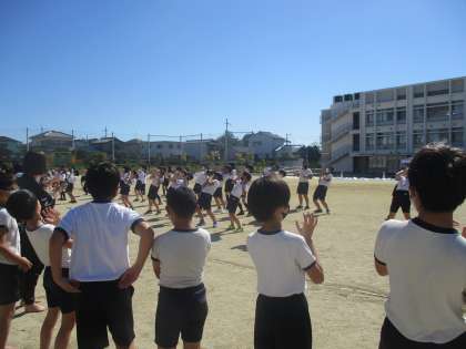 つぎは6年生の演技です。最初のダンスを,5年生も見よう見まねで踊っています。