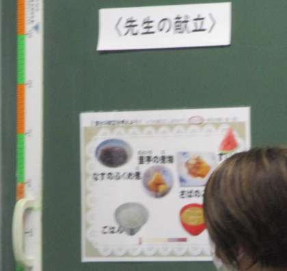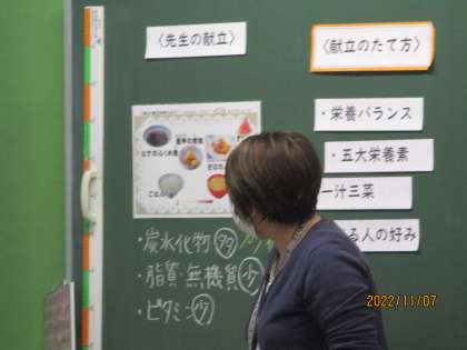 6年家庭科の学習の様子です。平日の夕食として先生がつくった献立について,みんなで考えています。