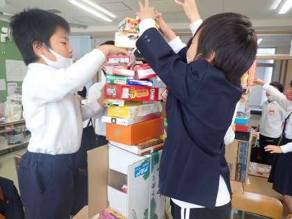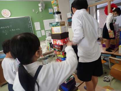 1年1組 算数 かたちあそび 公開日 2022/11/08 更新日 2022/11/08 1年 かたちあそびの学習に取り組んでいます。はこを様々な角度から見て,高く積むためにはどうすればいいかを考えながら,箱積み競争に取り組んでいます。制限時間があるので,素早く判断しないといけません。この後,図工でもはこを使うようです。かたちを見る豊かな感覚を養えそうですね。