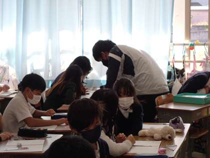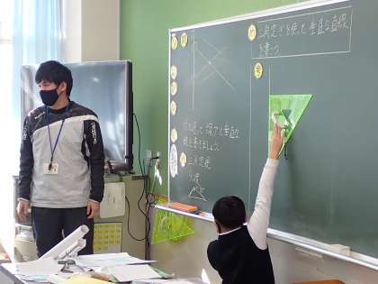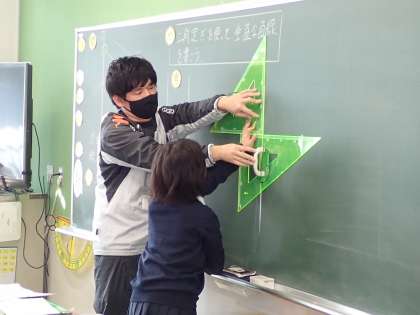 4年3組 算数 公開日 2022/11/08 更新日 2022/11/08 4年 1つの直線に対して,ある点を通って垂直な直線を引く活動をしています。担任の先生は,困っている児童に寄り添って一緒に考えています。前に出て発表する人は,とてもわかりやすく説明していました。