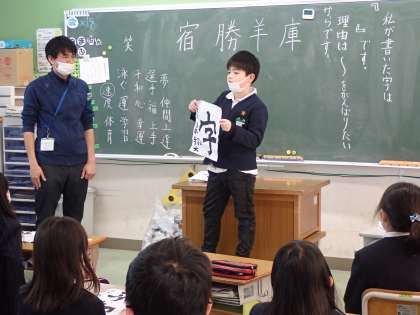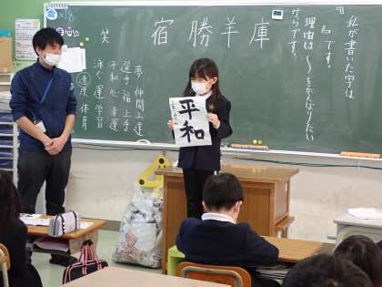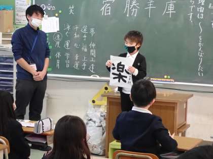 書初めで表現した今年の目標を一人ひとりがみんなの前で発表していました。一人ひとりが設定した目標は素晴らしいもので,設定した理由もしっかり伝えることができていました。聴く雰囲気もよくできているので,発表しやすそうでした。