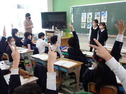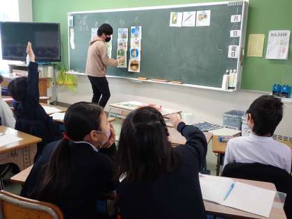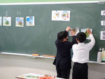 冬の生き物を見つける学習の導入です。子どもたちは自分がもっている知識や,身の周りの様子から,それぞれの生き物の様子が春・夏・秋・冬のどこに当たるのかを考えていました。隣同士でしっかりと考える姿が印象的でした。