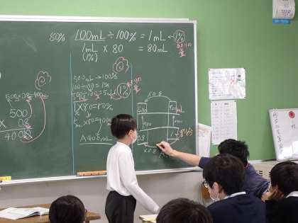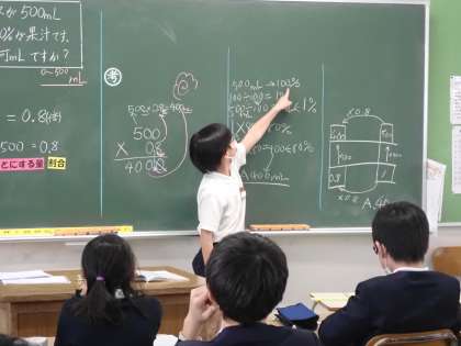 割合の学習です。今日も比べる量を求める問題でした。割合を求める公式を使って式を変形する人,1%あたりを求めてから答えを導く人,数直線を使って数量の関係を捉えて問題解決する人など,多様な考えをもとに,自分がやりやすい方法を見つけていました。