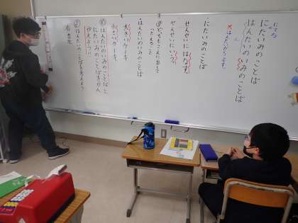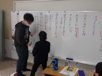 似た意味の言葉と反対の意味の言葉の学習をしていました。普段から使ったり,よく耳にしたりしているので,スムーズに学習が進められていました。先生と一緒に楽しそうに学習していました。