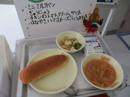 今日は、旬のブロッコリーとカリフラワーをつかった「花野菜のマヨネーズ風味焼き」でした。ブロッコリーやカリフラワーは、植物の蕾や花の部分を食べる野菜です。ツナ・玉ねぎ・にんじん・マヨネーズ風ドレッシングと混ぜ合わせ、オーブンで焼きました。子どもたちにも人気の献立です。