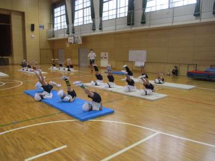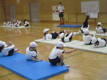 マット運動のいろいろな技のもとになる感覚づくりのための動きをしています。