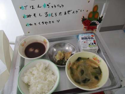 「小正月」には、古来より魔よけの力があると信じられていた小豆と鏡開きの餅を使って無病息災を願いぜんざいを食べる風習がありました。今日は給食で「白玉ぜんざい」が登場しました。調理員さんは、朝からやわらかくおいしく炊けるよう小豆を炊いてくれました。この1年間、みんなが健康ですごせますように…