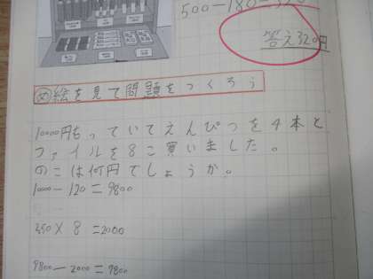 こちらも残金を求める問題ですが,10000円で文房具の大人買いをするようです。みんな真剣に問題作りに取り組んでいました。