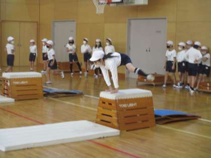 手をつくまでのジャンプも大きいダイナミックな動きも出てきました。互いの動きをよく見合い,いい刺激を与えあって動きを高めています。