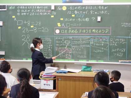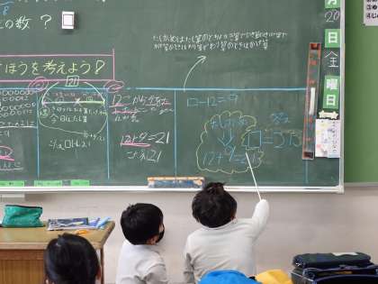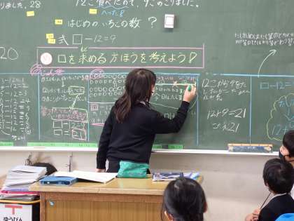 3年1組 算数2 公開日 2023/01/20 更新日 2023/01/20 3年 □を使った式の学習です。1人ずつ発表しましたが,簡潔にまとめられているので,とても聞きやすいです。学習の最後のまとめも発表する人がいました。 子どもが主役となって授業が進んでいるので,子どもたちは楽しく学ぶことができていました。