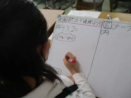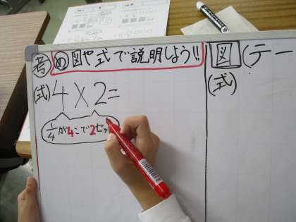 各自がホワイトボードに考えを書いています。この人は,帯分数「2と4分の3」の「2」が4分の1のいくつ文になるのか から考えています。