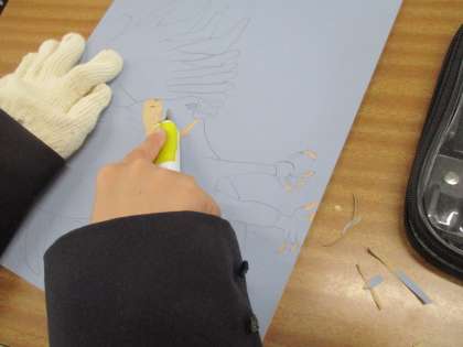 けがを防ぐために,版木を押さえる手には手袋をしています。