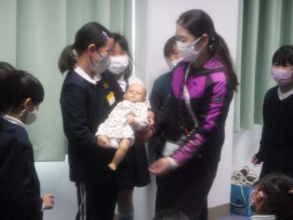 人形を抱っこすることで実際の赤ちゃんの重みを感じ,「いのち」の大切さについて考えていました。