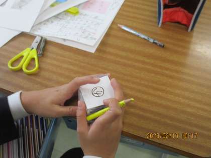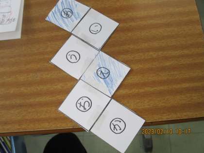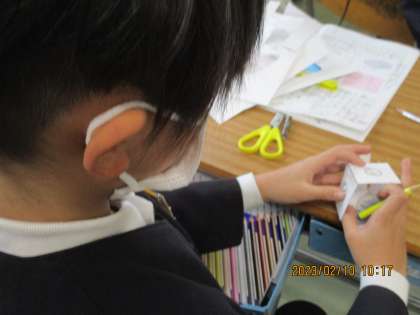おもしろい形の展開図ができました。組み立てたときに向かい合う「あ」と「え」に同じ色を塗っています。