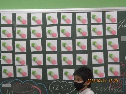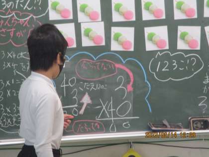 式は3×40ですが、2けたの数をかける計算はまだ学習していません。そこで、かけ算はかける数とかけられる数の順序を変えても答えは変わらないという性質を使って、40×3で答えを求める考え方を説明しているところです。