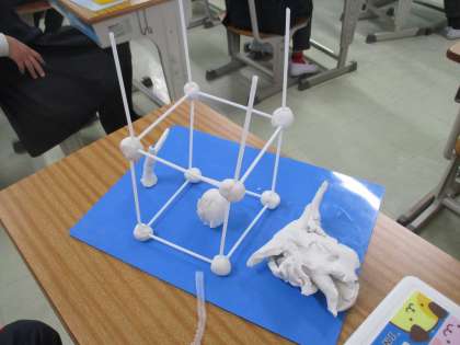 2年算数の学習です。粘土と同じ長さのストローを使って、サイコロの形(立方体)を作っています。