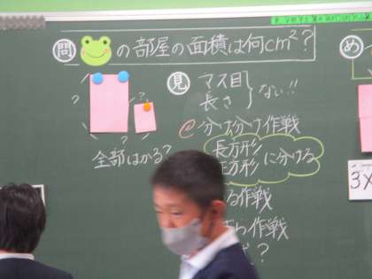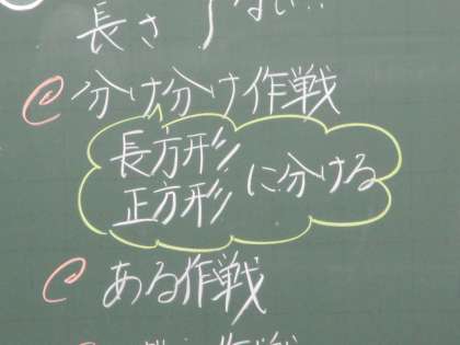 4年算数の学習です。「凸」のような形の面積の求め方が問題です。今わかっている長方形や正方形の求め方を使えないかを考えています。