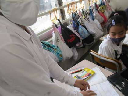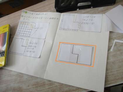 自分でもいろいろ考えつつ、仲間との交流で、問題の図形を2つ組み合わせて長方形を作り、その面積を2でわる方法を見つけてきました。