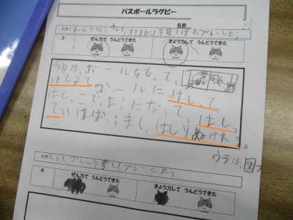 「走って」という言葉が多くでてきています。得点場面でランをうまく使えたことが印象に残っているようです。前のページの人とは同じチームなので、2人の考えをうまく組み合わせれば、さらに得点がとれるかもしれませんね。