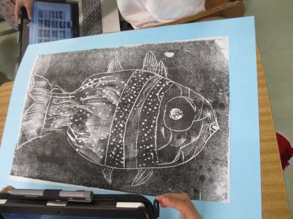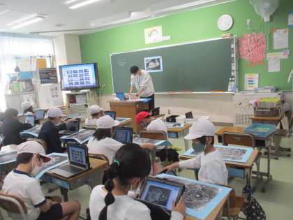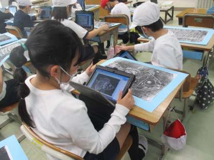 2年図工の学習です。出来上がった版画を写真にとって、互いの作品をPCでみられるようにしてます。