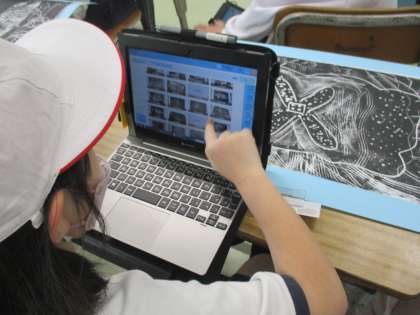 いろいろな形や点を使ったり、線の太さを変えたりして、白黒ですが「きれいだな」と感じる作品になっていますね。
