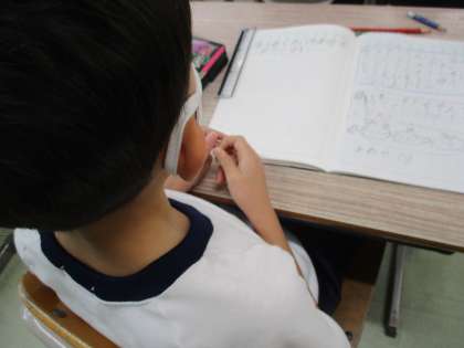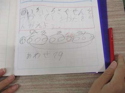 問題の場面を表すために、並んでいる人を○で表してノートに書き、考えています。
